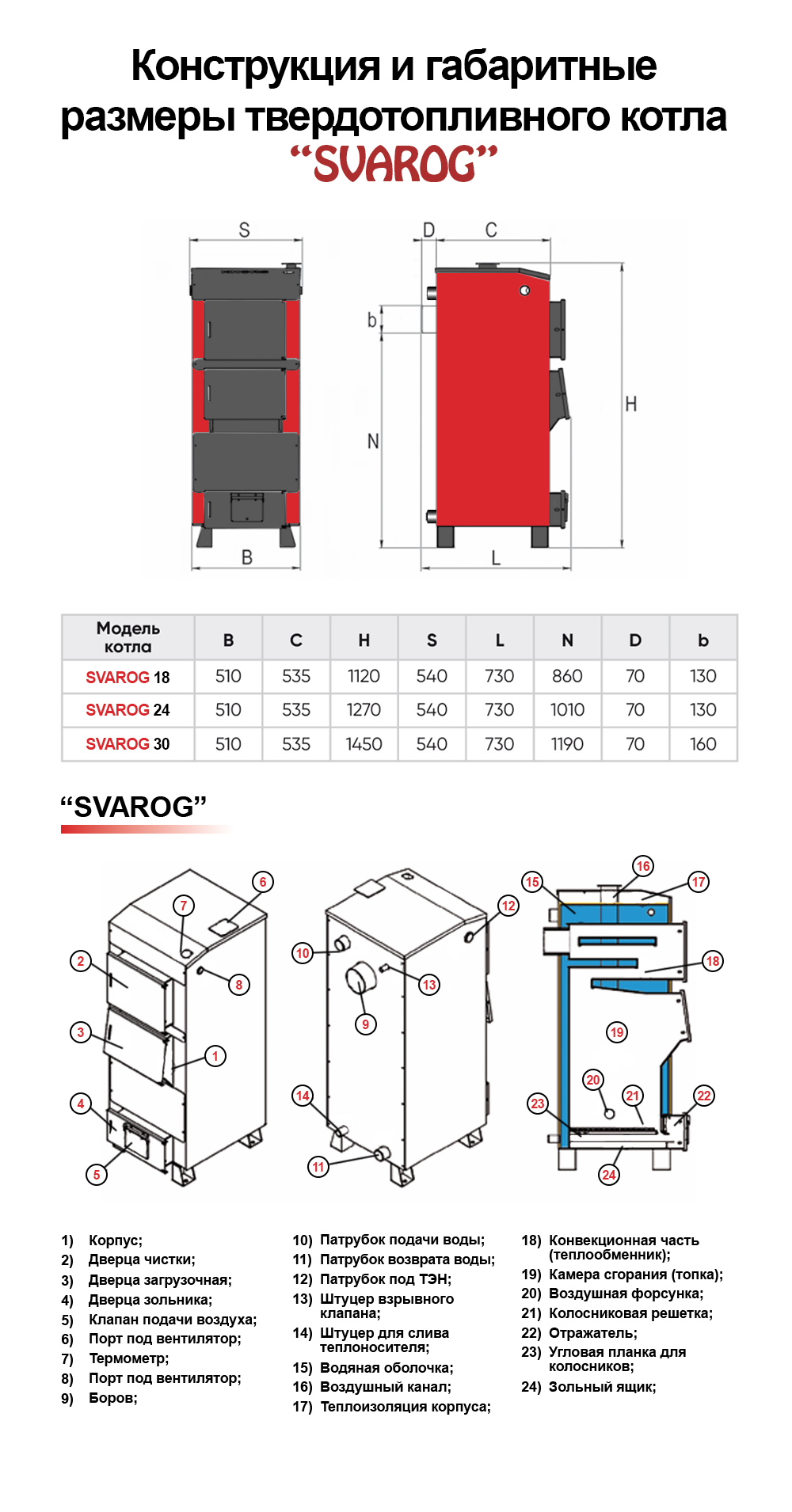Твердотопливный котел Сварог 30 — разработка нашего предприятия STEEL PROM GROUP. Предназначена модель для обогрева разных типов помещений до 300 м2. Надежный и долговечный, благодаря качеству сборки и используемых изготовителем материалов, этот твердотопливный котел прослужит годами. В конструкции предусмотрены отсеки для чистки и загрузки топливных материалов. Способен работать на угле, дровах, опилках. Безопасен в эксплуатации, имеет небольшие габариты, а потому легко найти для него место в любом помещении.