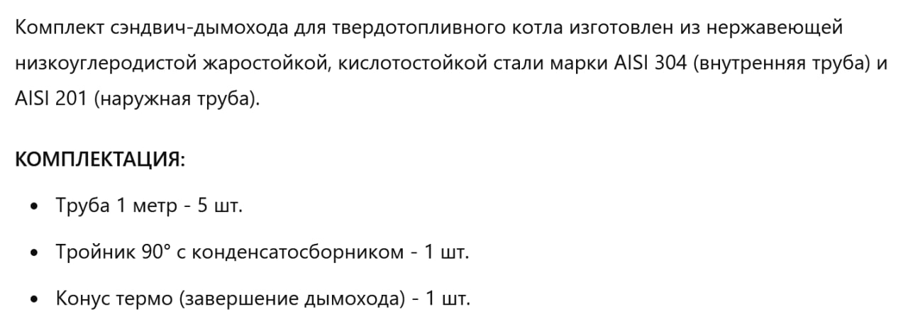 Если вы ищете надежное решение для отвода дымовых газов от твердотопливного котла, обратите внимание на комплект дымохода сэндвич ⌀130/200 из нержавеющей стали. Этот комплект — идеальное сочетание безопасности, долговечности и простоты монтажа. Пять метров качественной трубы обеспечат эффективное удаление продуктов сгорания, а двухслойная конструкция гарантирует надежную изоляцию и устойчивость к температурным колебаниям.