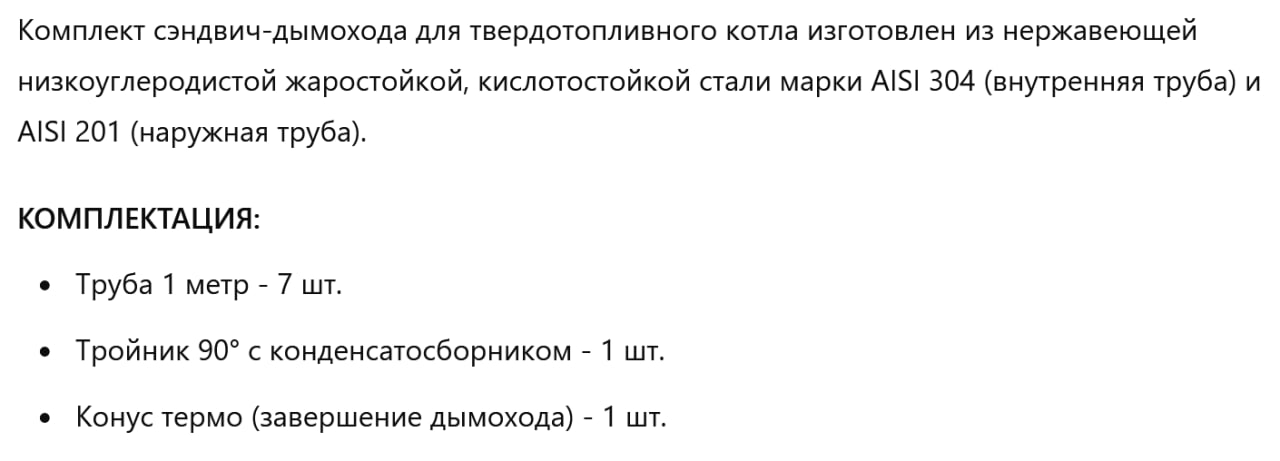 Выбор качественного дымохода — это не просто инвестиция в комфорт, но и в безопасность вашей семьи. Нержавеющая сталь AISI 304, система "сэндвич", оптимальная длина и простота установки делают этот комплект лучшим решением для вашего дома. Он обеспечит долговечность и эффективную работу вашей отопительной системы без лишних затрат на обслуживание.